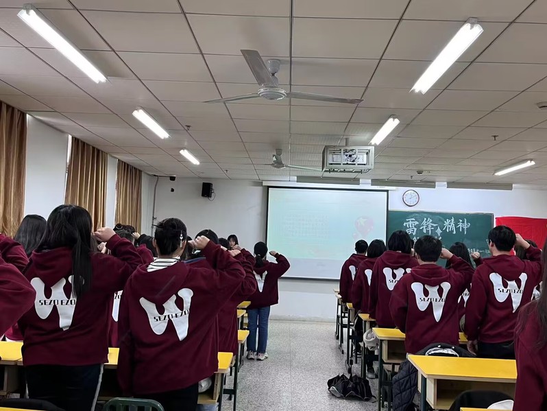 团课过程中,团支书引领青年学子以观看视频、配乐诵读、交流感悟、集体宣誓等方式,加强对新时代雷锋精神的青年化阐释,学习新时代雷锋精神,领悟雷锋精神的丰富内涵。此外,各团支部邀请“中国大学生自强之星”、“最美职校生”、省级“三好学生”、省级社会实践先进个人等社会实践和志愿服务中的先进典型代表通过亲身讲述、分享交流、朋辈对话等形式,生动展示当代青年“小我”融入“大我”的青春风采,发挥“身边榜样”的示范带动作用,团员青年围绕如何“践行新时代雷锋精神”展开热烈讨论,纷纷表示从身边的小事做起,积极参与志愿服务活动,传承雷锋精神。团建指导员全程观摩并在团课结束后进行点评指导。