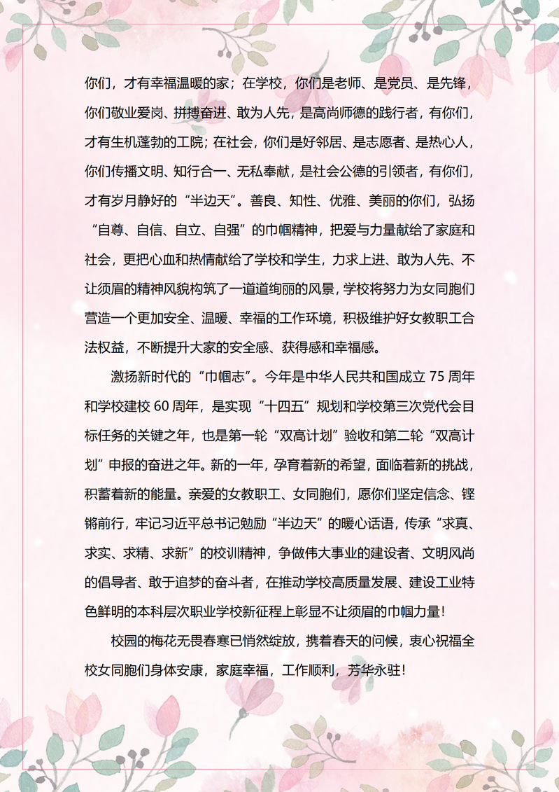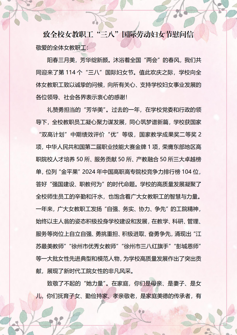 致全校女教职工“三八”国际劳动妇女节慰问信