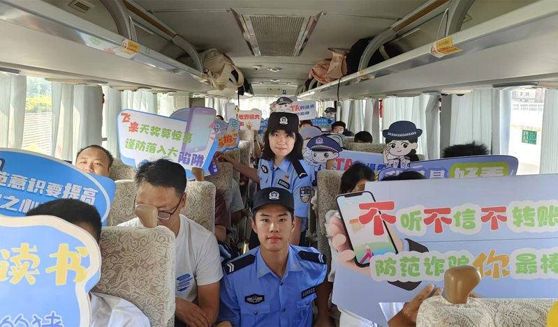反诈宣传进大巴,让新生接驳车变身“反诈”移动小课堂。“各位乘客大家好,欢迎乘坐“工院号”反诈迎新专列,乘务组全体反诈工作人员将为您提供全方位、无死角反诈宣传服务!”9月10日-11日,来自市公安局鼓楼分局反诈中心和九里派出所的反诈民警们纷纷坐上“工院号”反诈迎新大巴,为刚刚抵徐的新生和家长们宣讲相关防骗知识,形成了一条流动的反诈宣传风景线。民警们紧紧围绕当前大学生易遭受的电信网络诈骗案件类型,通过案例讲解和知识问答等方式和新生们快速熟识,将反诈意识潜移默化地植入学生心间,帮助新生第一时间筑牢反诈防线。