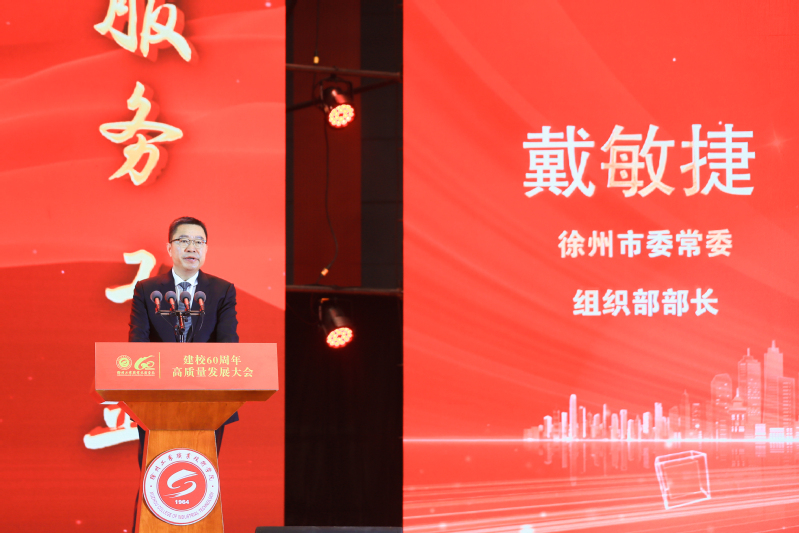 徐州市委常委、组织部部长戴敏捷在讲话中指出,徐州工业职业技术学院在扎根徐州的60年间,全体师生员工在历届党委和行政班子的带领下,取得了令人瞩目的成就。近三年来,学校为徐州地区培养输送了大批高素质技术技能人才,解决了众多企业技术难题,产生了显著的经济效益和社会效益。在新的时代征程上,希望学校以高质量发展大会为新契机,锚定“国内一流、海内外有影响的工业特色鲜明的本科层次职业学校”的建设目标,聚焦“区域经济社会发展”需求,进一步深化产教融合改革,不断提升学校服务徐州市“343”创新产业集群的匹配度和贡献度。
