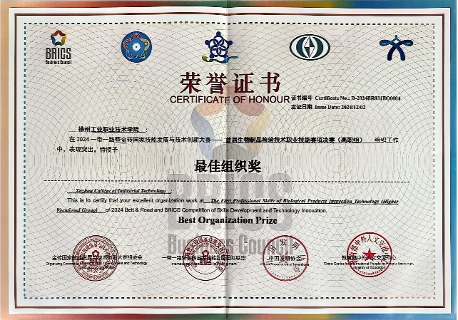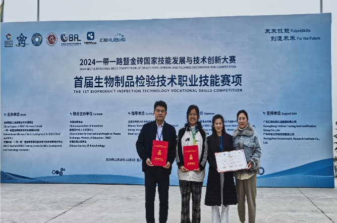 2024年“一带一路暨金砖国家技能发展与技术创新大赛”首届生物制品检验技术职业技能赛项总决赛于2024年11月29日—12月2日在重庆工贸职业技术学院举办,化学工程学院李毓敏、吴昊老师指导的药品生物技术专业2022级学生袁晨曦历经4天的激烈角逐,凭借着扎实的专业知识、精湛的实操技能、过硬的心理素质,在全国77所高职院校中脱颖而出,荣获一等奖(金奖),指导教师李毓敏荣获优秀指导教师荣誉,我校被授予全国总决赛最佳组织奖。