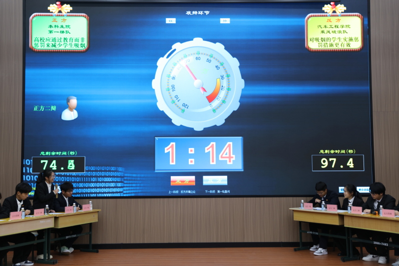 汽车工程学院代表队和本科生院代表队围绕“高校减少学生吸烟更有效的措施到底是教育还是惩罚”在季军争夺赛中也难分高下。汽车工程学院(正方)认为惩罚相比教育具有更强的威慑力,不管是教育还是惩罚都会激起学生的逆反心理,但相比之下惩罚比教育见效快,成效高;本科生院(正方)认为吸烟是一个长期形成的习惯,通过一次、两次地惩罚并不能从根本上解决问题。高校学生基本已成年,具备辨别是非好坏的能力,所以更应当用教育让他们深刻体会到吸烟的危害从而减少吸烟现象。