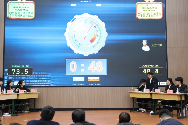 其中,材料工程学院代表队和工商管理学院代表队围绕“网络游戏是否有助于提高学生的团队合作能力和解决问题的能力”在冠军争夺赛中展开了激烈且精彩的辩论;工商管理学院(正方)认为不应因少数人沉迷网游而忽视大多数人的需求,网游本身已经成为一种交流途径、交友方式,即使它是一个虚拟的空间,但是我们从中体验的情感、获得的经验都是真实的。材料工程学院(反方)认为网络游戏会让玩家沉浸在虚拟世界,压缩现实交际空间和时间,同时游戏中的经验无法真正运用到实践上,从而造成个体不适应现实生活,逐渐变得孤独和孤立,导致团队合作能力降低。