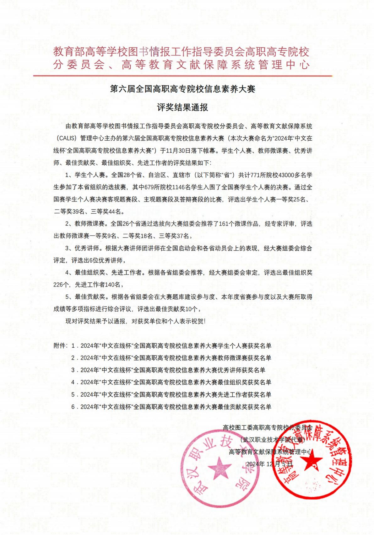 近日,“中文在线杯”全国高职高专信息素养大赛在激烈角逐中落下帷幕。我校学生唐浩、曹思彤同学分别获得国赛一等奖与二等奖,吴雅丽、李莹老师分别荣获教师微课赛三等奖、优秀奖,李莹、李雨婷、王一哲三位老师被授予“优秀指导教师”的称号,我校荣获“最佳组织奖”。