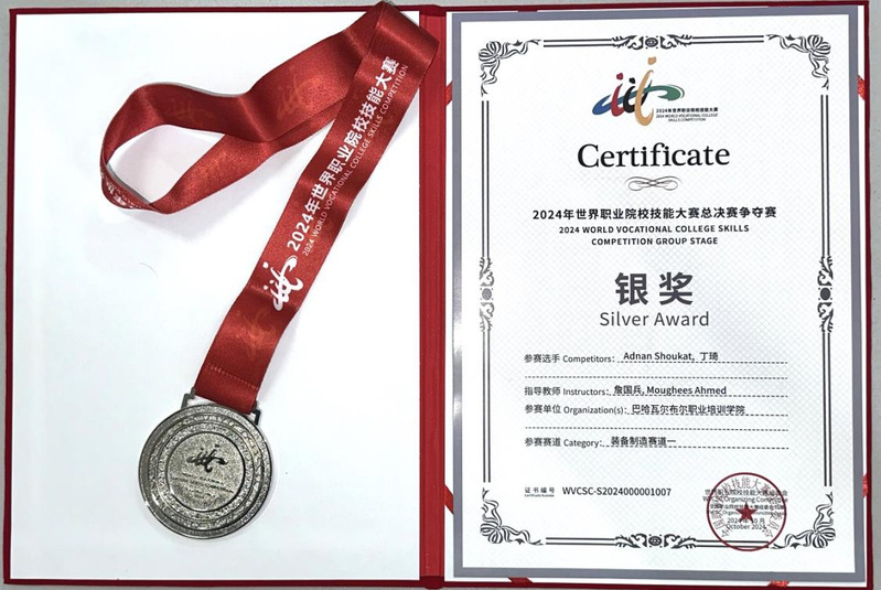 近日,2024年世界职业院校技能大赛总决赛国际组争夺赛落下帷幕,国际组“装备制造赛道一”比赛经过激烈角逐,最终决出金奖7项,银奖10项,铜奖14项。我校詹国兵老师指导来自巴基斯坦的留学生Adnan Shoukat和机电一体化(3+3)2301班的丁琦组队参赛,最终荣获银奖。