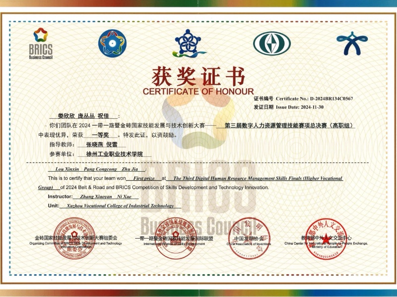 近日,2024“一带一路”暨金砖国家技能发展与技术创新大赛——第三届数字人力资源管理技能竞赛全国总决赛落下帷幕,来自全国159支从初赛晋级的优秀团队同台竞技,经过激烈比拼,由张晓燕、倪雪老师指导的我校工商管理学院市场营销、会计专业的祝佳、庞丛丛、娄欣欣同学脱颖而出,荣获总决赛一等奖。同时,我校荣获“最佳组织奖”。