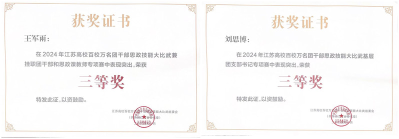 近日,由共青团江苏省委联合中共江苏省委教育工委、新华日报社、江苏省学生联合会共同举办的江苏高校百校万名团干部思政技能大比武决赛落下帷幕,我校机电工程学院王军雨老师获兼挂职团干部和思政教师专项赛三等奖、汽车工程学院刘思博同学获基层团支部书记专项赛三等奖。