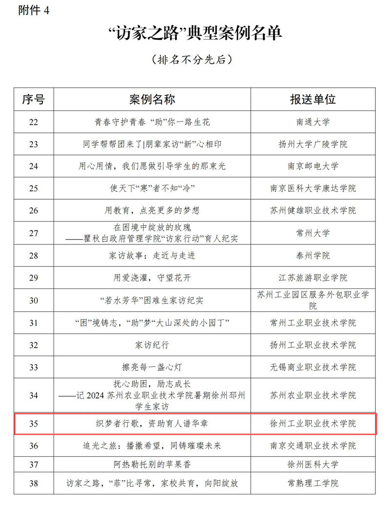 近日,江苏省教育厅正式公布了2024年“苏乡永助”资助育人主题活动的评选结果。我校在此次活动中表现突出,多个项目及个人荣获佳绩。其中,工商管理学院的“红心向党・感恩同行——传承淮海战役革命精神资助育人研学实践活动”案例荣获研学实践典型案例;化学工程学院的“织梦者行歌,资助育人谱华章”案例荣获“访家之路”典型案例。此外,学生工作处许峰老师荣获“江苏学生资助宣传大使”(资助工作者)称号,汽车工程学院新能源汽车2204班的黄浩楠同学荣获“江苏学生资助宣传大使”称号。