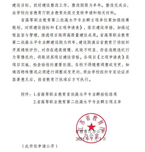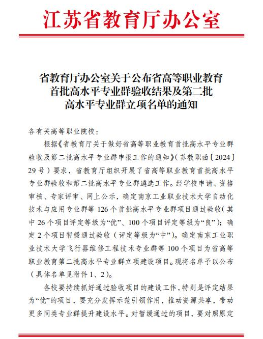 近日,江苏省教育厅发布了《省教育厅办公室华体会网页版公布省高等职业教育首批高水平专业群验收结果及第二批高水平专业群立项名单的通知》,我校现代物流管理专业群、药品生产技术专业群和物联网应用技术专业群顺利通过验收,并取得“1优2良”的好成绩,其中现代物流管理专业群荣获优秀评价;机电一体化技术专业群和新能源汽车技术专业群获批省级第二批高水平专业群建设立项,充分展现了我校在完善立德树人机制、人才培养模式创新、课程体系与教学资源建设、教材建设与教法改革、教师教学创新团队建设、产教融合平台建设、服务发展能力提升、管理体制和运行机制等方面的特色做法与成效。
