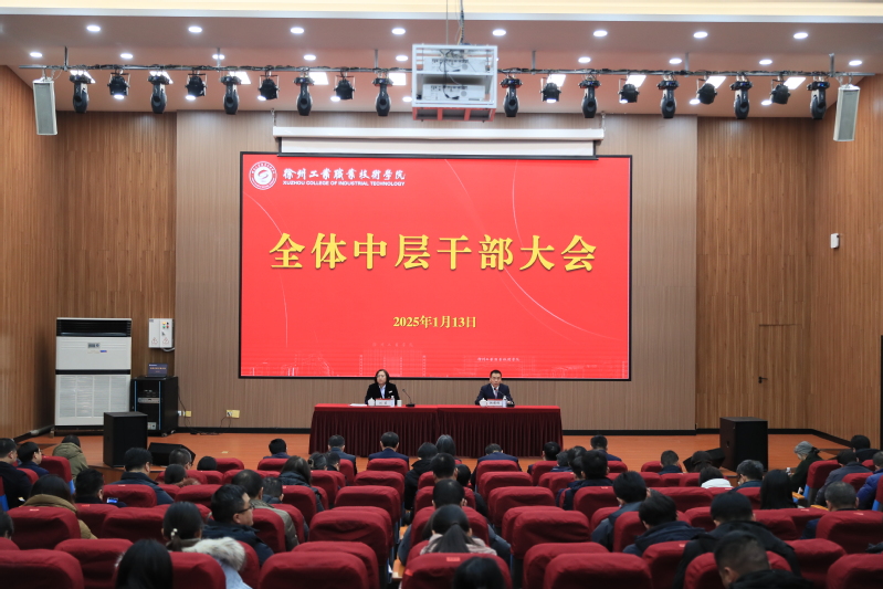 1月13日下午,我校在西门报告厅召开全体中层干部大会,回顾总结2024年主要工作,安排部署寒假和开学初工作。全体校领导、党委委员、中层干部参加了会议。党委书记刘莹作总结讲话,大会由校长鲍桂楠主持。