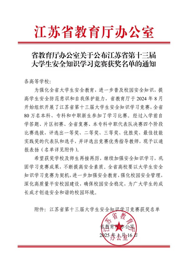 近日,由省教育厅主办的江苏省第十三届大学生安全知识竞赛落下帷幕。我校由阮佳乐、金蕊、朱宇同等三名学生组成的代表队荣获省赛三等奖,保卫处杜庆深、贾翔翔荣获优秀指导教师。