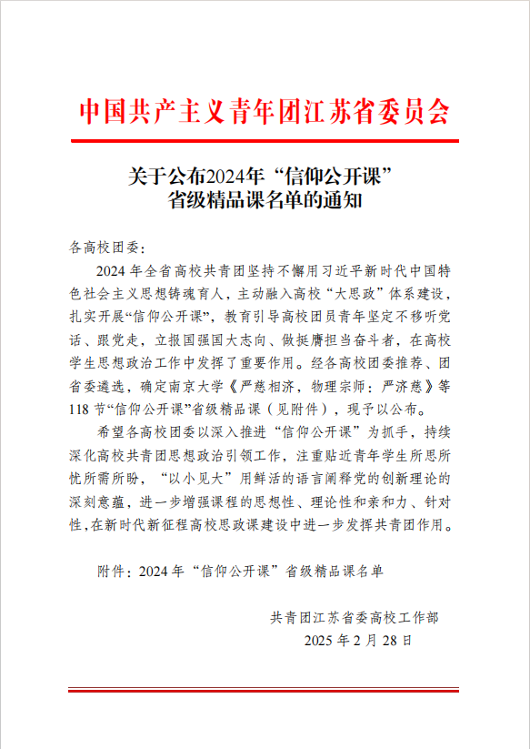 近日,共青团江苏省委公布了2024年全省高校“信仰公开课”省级精品课评选结果,共评出118节“信仰公开课”省级精品课,我校报送课程获评省级精品课,连续五年获此殊荣。