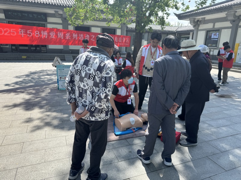 5月10日上午,学校志愿者团队走进国家4A级旅游景区龟山景区,将急救科普与历史文化传承深度融合。在售票大厅前,志愿者通过模拟心肺复苏、AED操作和海姆立克急救法,还原“黄金四分钟”救援流程,吸引游客现场实操练习。将急救知识嵌入汉墓文化讲解,累计发放急救包、宣传手册300余份;定制“心肺复苏教学扇”并与景区导览图配套发放,实现“急救科普+文化沉浸”双效传播。志愿者现场还为游客们进行了血压测量,对于血压异常游客现场作出耐心细致的叮嘱和解答,给予相应的建议,使每一位测量者对自身的健康状况做到心中有数,应对有方。