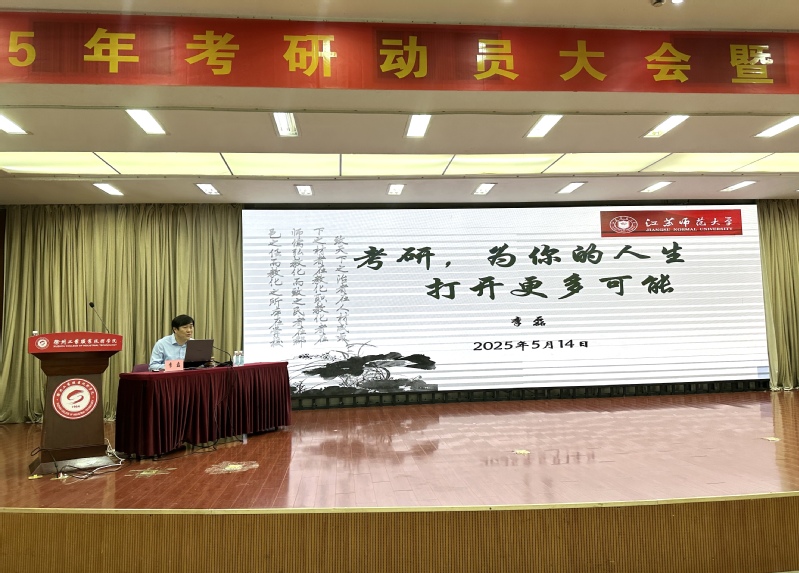 会议第一阶段,江苏师范大学研究生院培养与学位办主任李磊博士应邀做考研专题辅导报告。他从2025年研究生招考基本情况出发,详细解读了研究生类别的划分、研究生分类培养的模式、报考流程及关键时间节点,并就学生如何进行自身定位与学校及专业选择、制定科学合理的备考计划等进行了系统全面的解读和指导。李磊博士的报告内容详实、条理清晰,为即将踏上考研征程的学子们指明了方向,赢得了在场师生的阵阵掌声。
