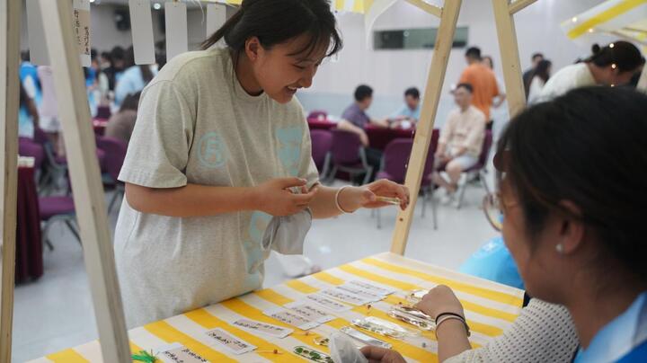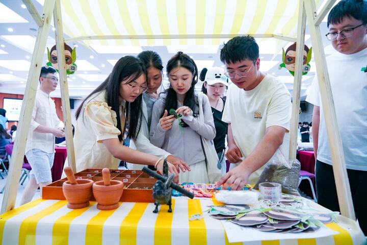 “岐黄手作·指尖国医”:最受学生热捧的当属文创实践区,文创区内艾叶薄荷香囊、UV胶封存药材书签、中药耳饰等创意作品琳琅满目。生物制药专业学生亲手研磨药材制作合香珠手串,将佩兰、丁香等草药转化为时尚配饰。“原来中医可以这么‘潮’!”参与香囊制作的学生感叹。