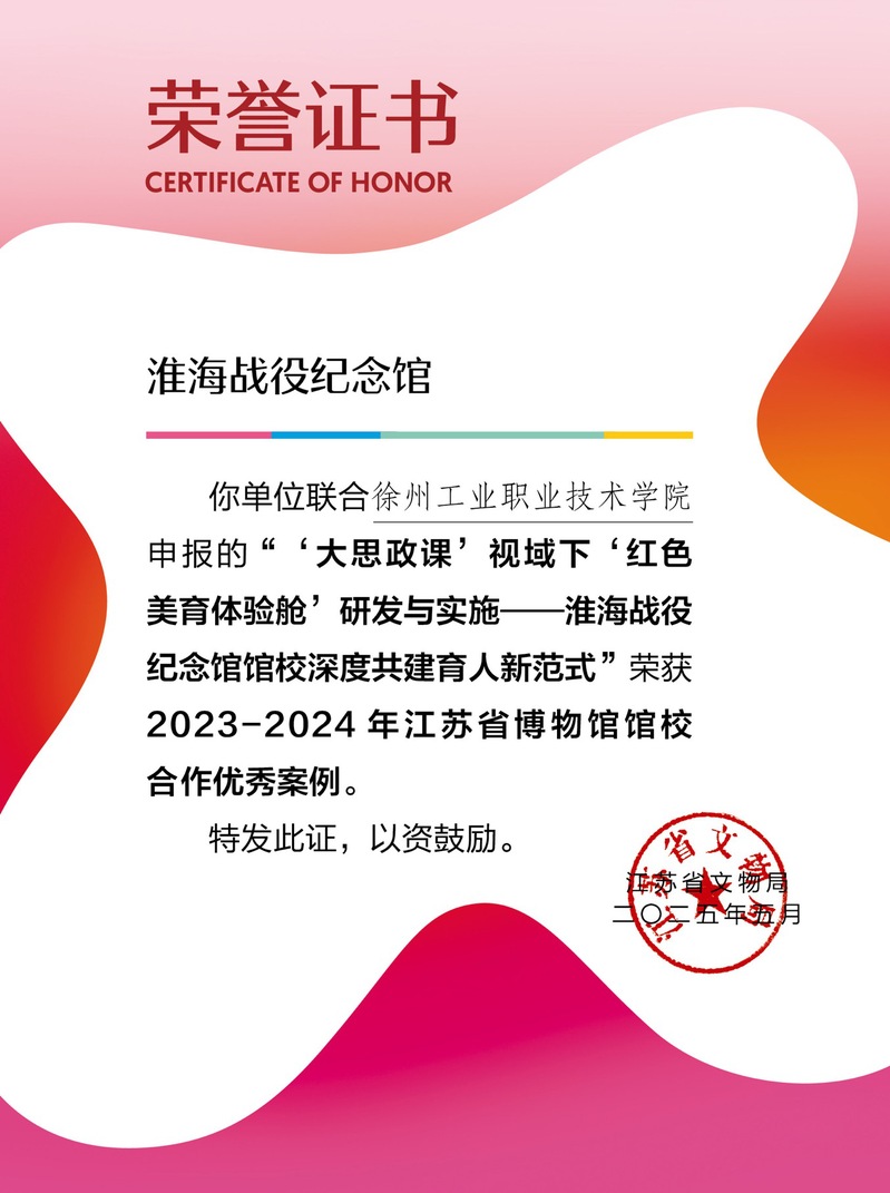 近日,江苏省文化和旅游厅公布2023-2024年度馆校合作优秀案例评选结果,我校与淮海战役纪念馆联合申报的《“大思政课”视域下“红色美育体验舱”研发与实施——淮海战役纪念馆馆校深度共建育人新范式》项目脱颖而出,成功入选全省20个优秀案例之一。