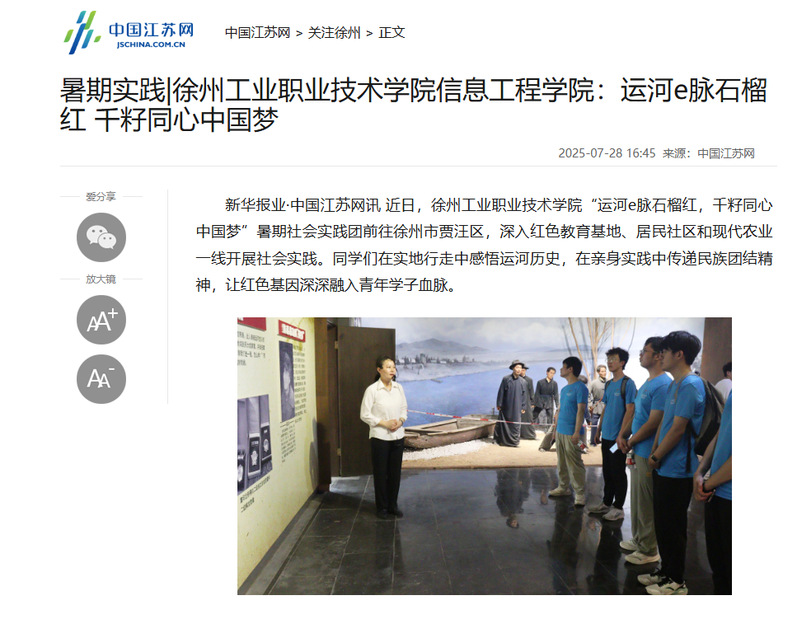 新华报业·中国江苏网讯 近日,徐州工业职业技术学院“运河e脉石榴红,千籽同心中国梦”暑期社会实践团前往徐州市贾汪区,深入红色教育基地、居民社区和现代农业一线开展社会实践。同学们在实地行走中感悟运河历史,在亲身实践中传递民族团结精神,让红色基因深深融入青年学子血脉。