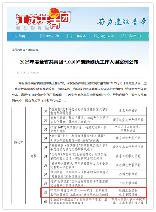 近日,共青团江苏省委公布了2025年度“10100”创新创优工作项目评选结果,我校团委申报的《听青声·解青忧·助青长——徐州工业职业技术学院共青团“三维感知”青年思想动态的探索》入围江苏省共青团“10100”创新创优工作案例。