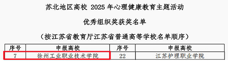 近日,由江苏省苏北地区大学生心理健康教育研究中心主办的2025年“五育润心沐光同行”苏北地区高校心理健康教育主题系列活动圆满落幕,我校师生凭借扎实的综合素养与出色的创作能力,荣获一等奖7项、二等奖9项、三等奖3项。同时,学校因组织工作得力、师生参与积极,荣获“优秀组织奖”。这一成绩不仅是对我校心理健康教育工作成效的充分肯定,也展现了我校师生积极向上、奋发有为的精神风貌。