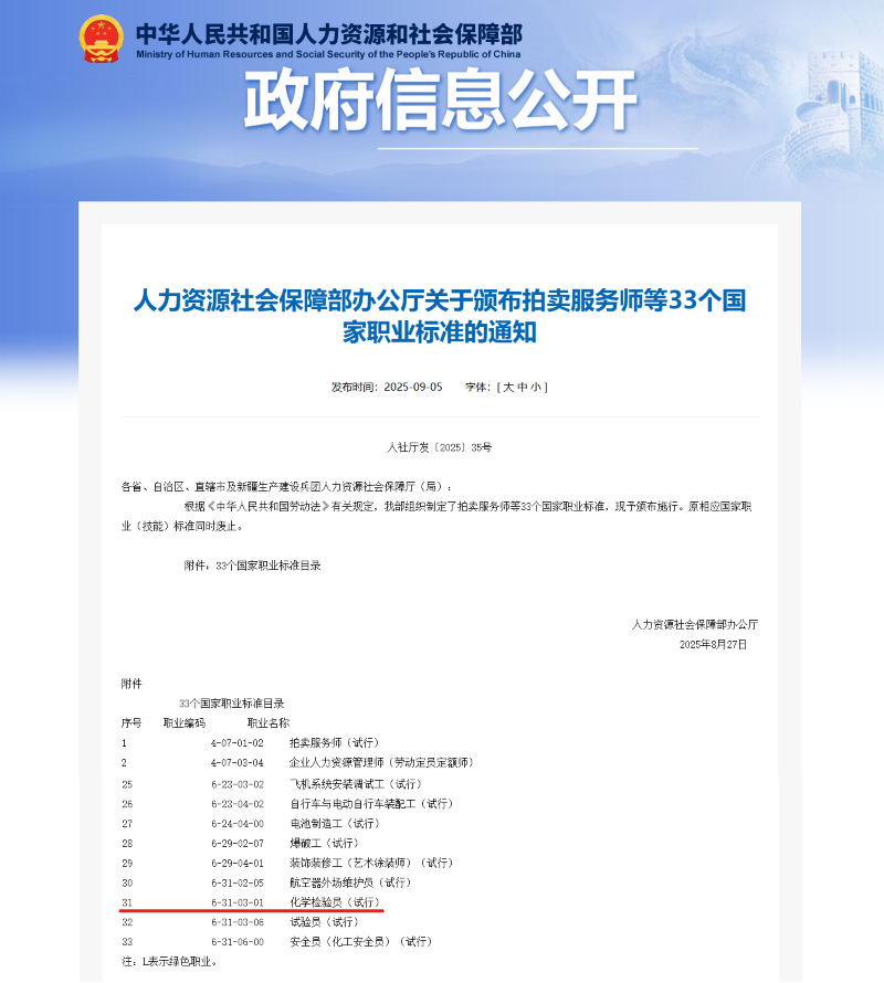 近日,人力资源和社会保障部办公厅印发《华体会网页版颁布拍卖服务师等33个国家职业标准的通知》(人社厅发〔2025〕35号),由我校作为第一单位编写的《化学检验员》(职业编码:6-31-03-01)国家职业标准位列其中。这标志着我校在参与国家职业标准制定、引领职业教育高质量发展方面取得了又一重大标志性成果。